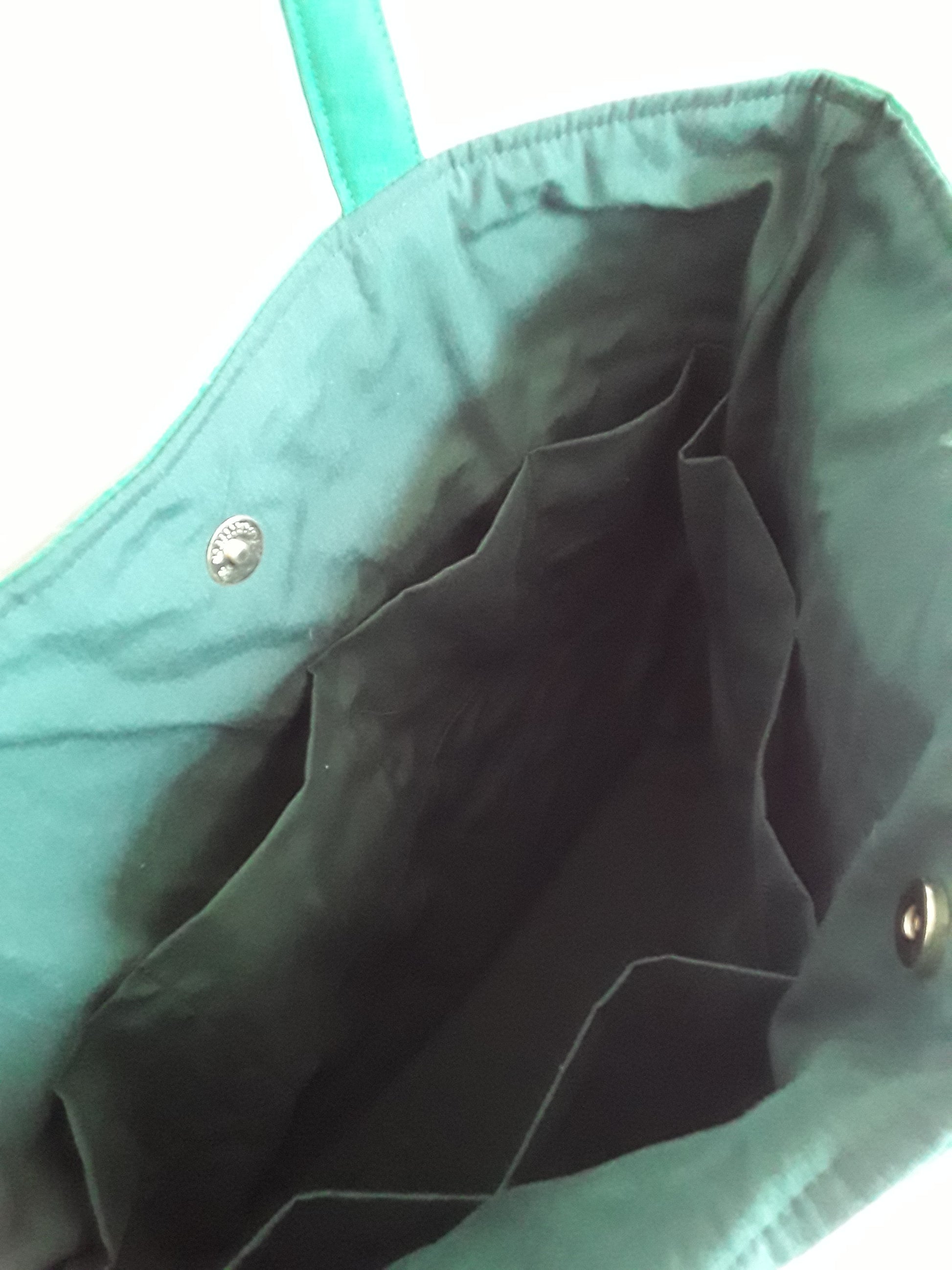 Upper bag is quilted, and the bag has a contrasting green inner lining.
