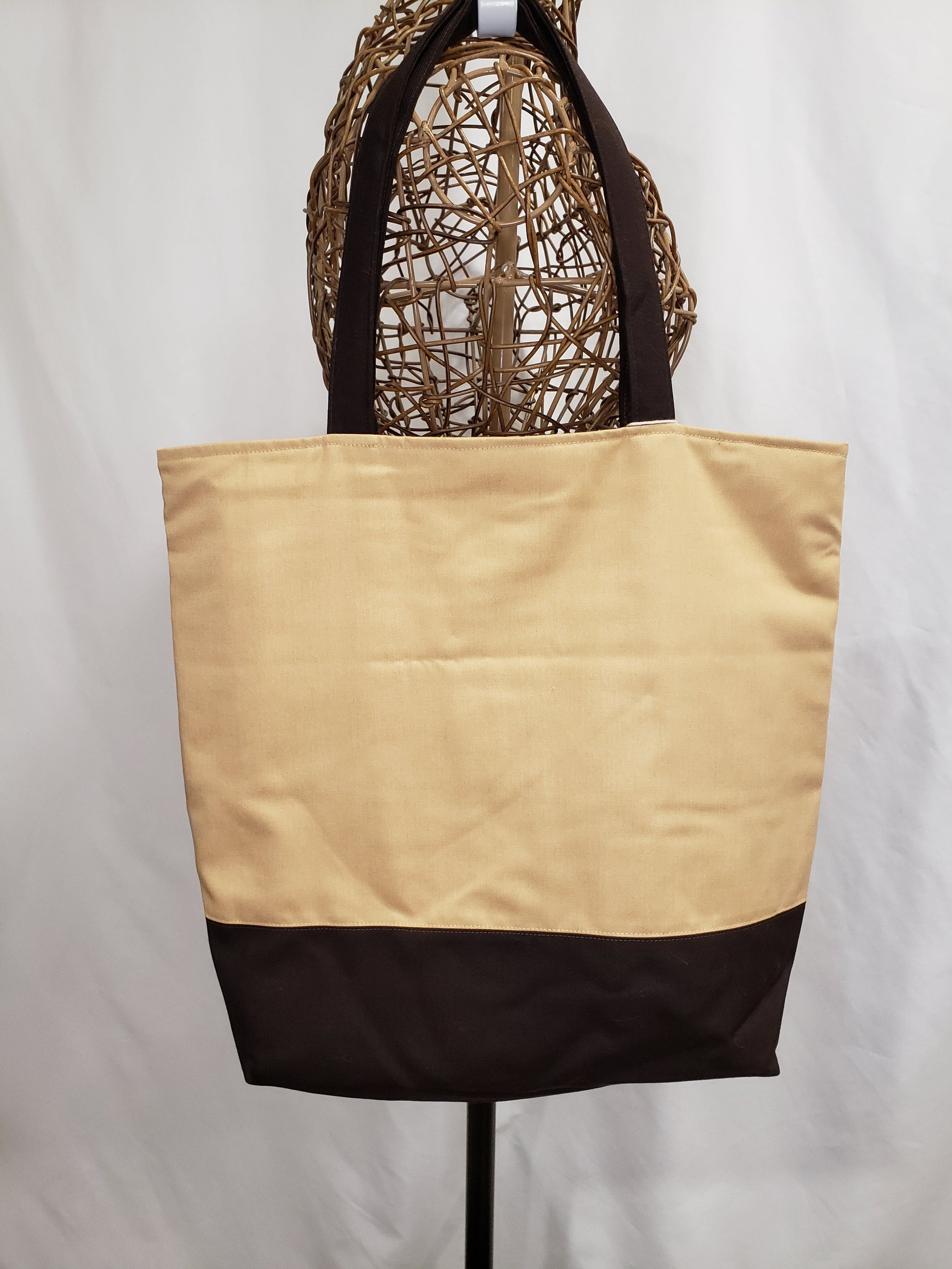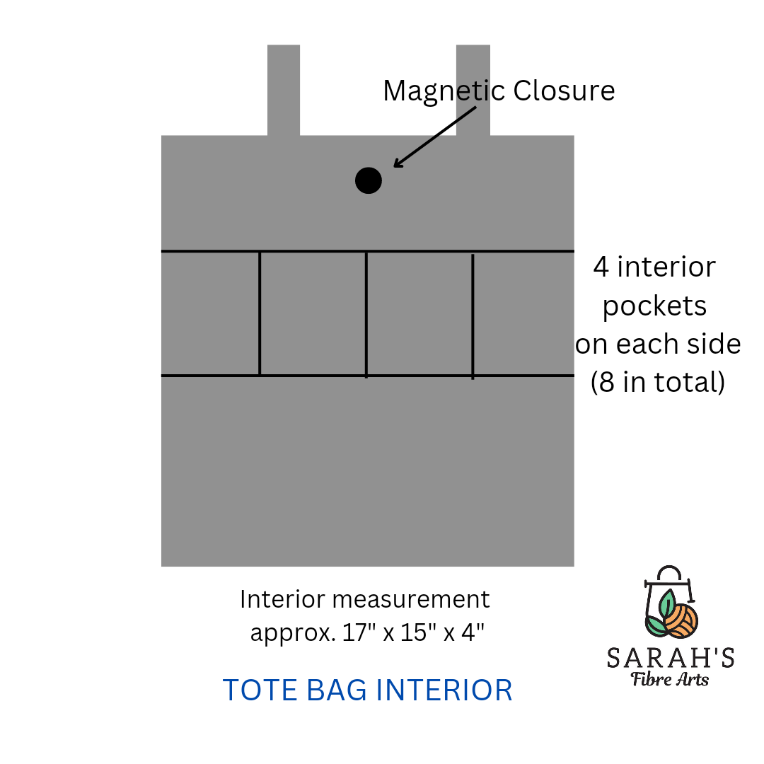 A beautiful and functional tote for all your projects. 8 interior pockets for notions, phone, etc. Brown base ensures that the bag is easier to keep clean. Measures 17 x 15 x 4 inches (43 x 38.5 x 10 cms). Handles 21.5 inches (54.5 cms)