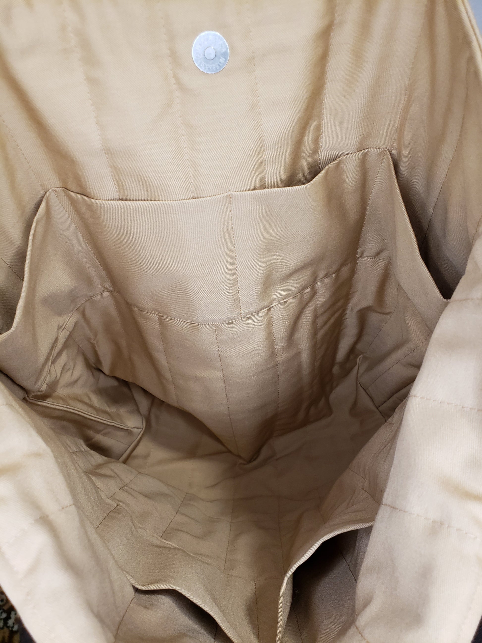 The interior of the bag is quilted, and the bag has a matching beige inner lining. And don't forget there are 8 pockets!