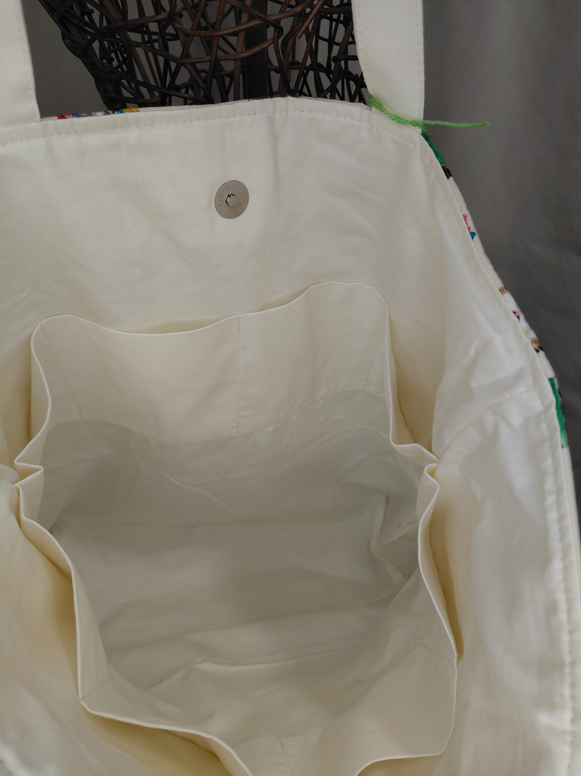 A beautiful and functional tote for all your projects. 8 interior pockets for notions, phone, etc. Vinyl base ensures that the bag is easily cleaned. Measures 17 x 15 x 4 inches (43 x 38.5 x 10 cms). Handles 22.25 inches (56.5 cms)